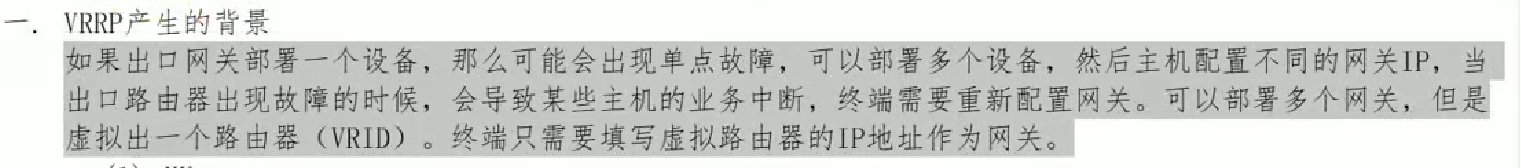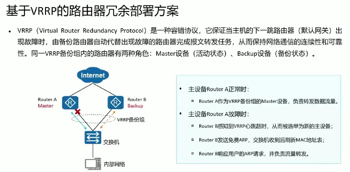 VRRP(Virtual Router Redundancy Protocol,虚拟路由器冗余协议) 是一种用于实现网关设备备份 的协议。它通过将多台物理路由器组合成一个虚拟路由器,为主机提供不间断的网关服务。