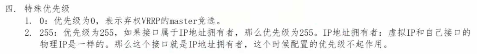 0 的特殊用途 :Master 如果想主动放弃身份(如管理员手动降级、或监控的上行链路失效),可以立即发送一个优先级为 0 的通告报文。Backup 收到后,会立即意识到 Master 主动退位,从而快速触发选举,无需等待 Master-Down 计时器超时。