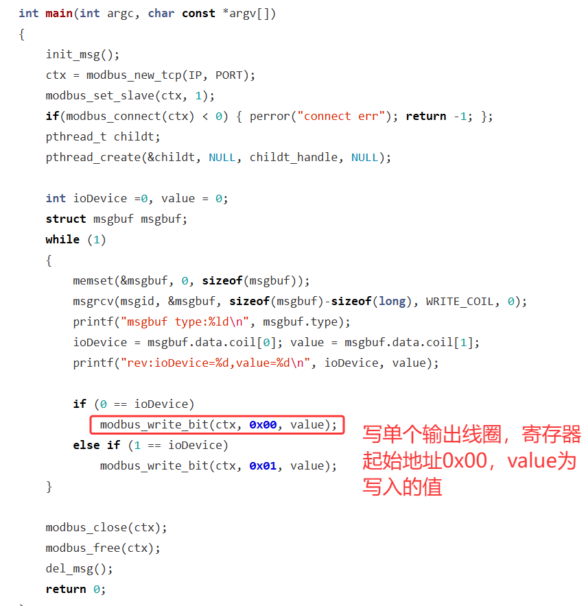 写单个线圈:modbus_write_bit(modbus_t *ctx, int addr, int status);