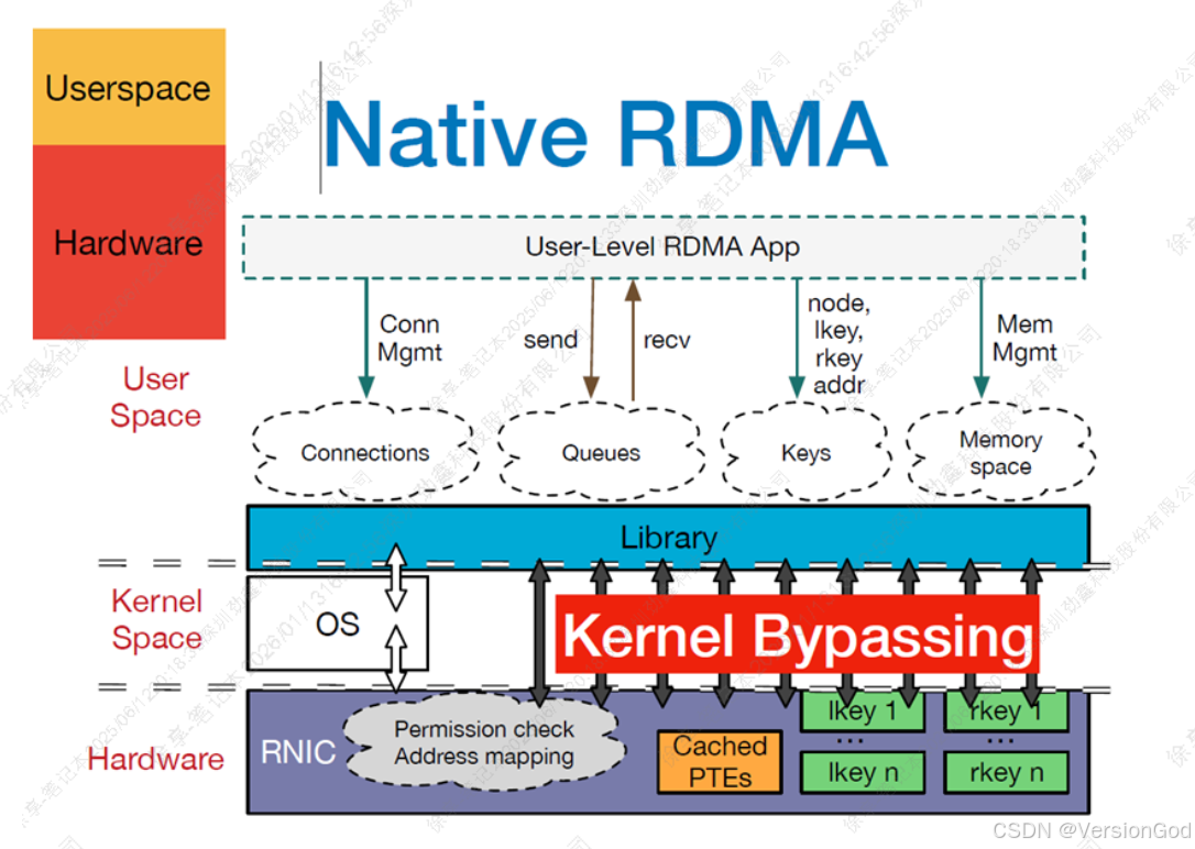 - Kernel Bypass:RDMA 提供一个专有的 Verbs interface 而不是传统的TCP/IP Socket interface。应用程序可以直接在用户态执行数据传输,不需要在内核态与用户态之间做上下文切换