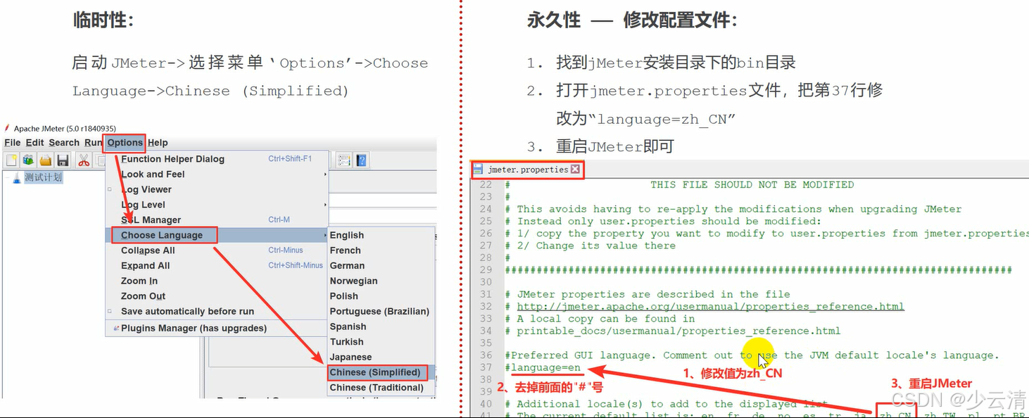 启动JMeter->选择菜单'Options' -> Choose Language -> Chinese (Simplified)