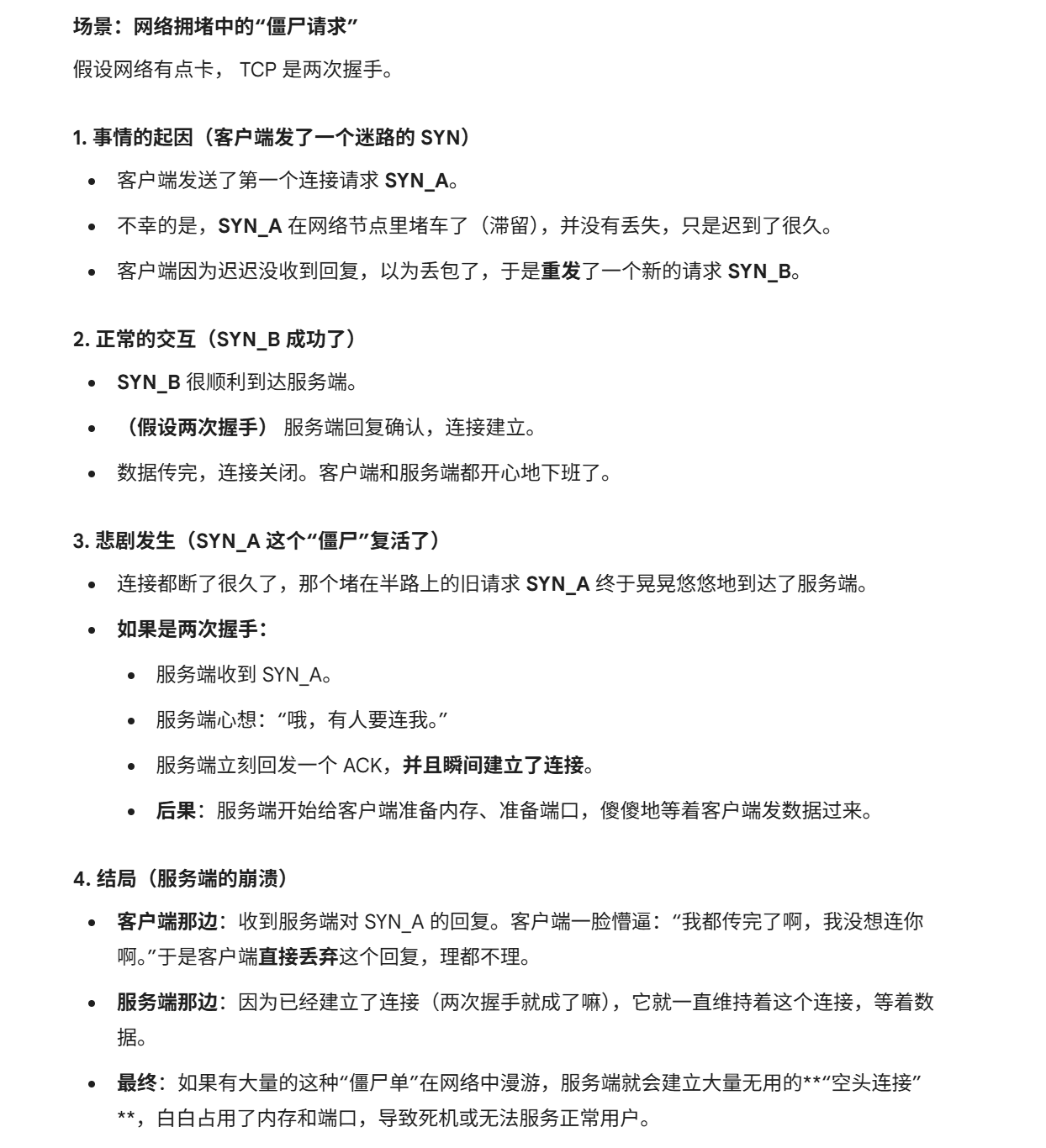 在发完第二步(SYN+ACK)之后,如果只有两次握手(没有第三步):