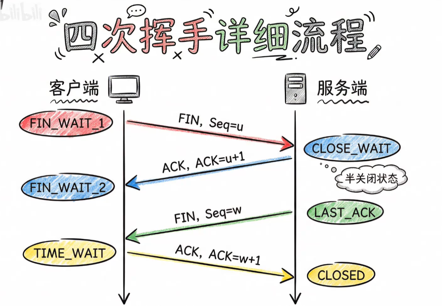 CLOSE_WAIT,客户端进入FIN_WAIT_2)- 此时,客户端 -> 服务端的通道关闭,但 服务端 -> 客户端 依然畅通。