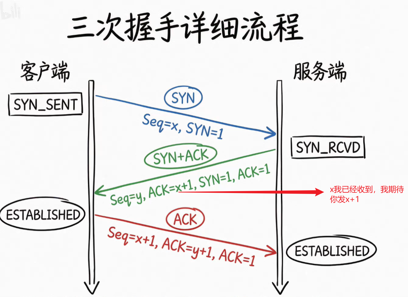 第三次 (ACK) :客户端回复。含义 :"收到 Y 了(ACK=Y+1)。连接建立,可以发数据了。"(客户端处于