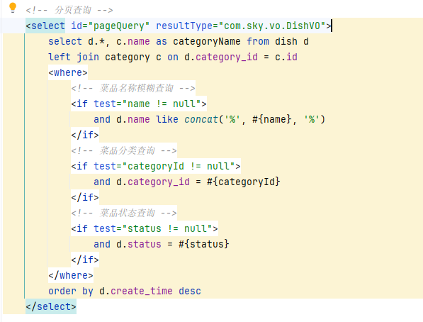 resultType="com.sky.vo.DishVO" 表示这条 SQL 查出来的每一行结果,MyBatis 要映射成 DishVO 对象