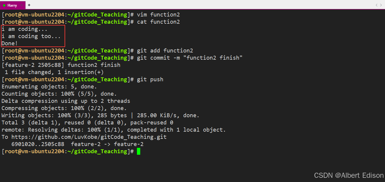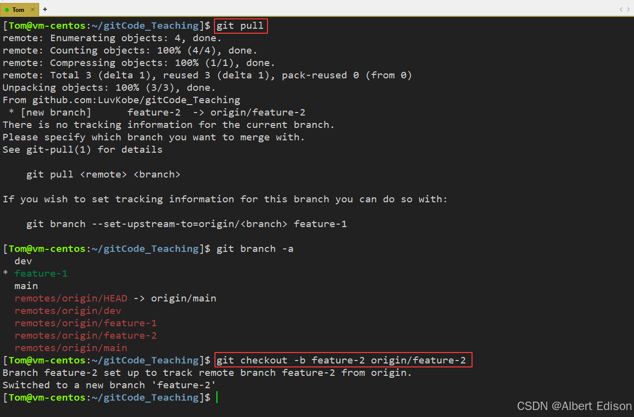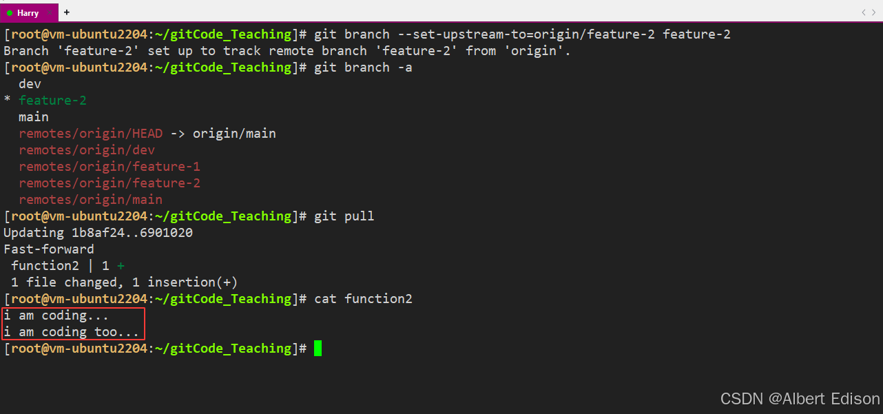 但天有不测风云,你的小伙伴 Harry 突然生病了,但需求还没开发完,需要你帮他继续开发,于是他便把 feature-2 分支名告诉你了。这时你就需要在自己的机器上切换到 feature-2 分支帮忙继续开发,要做的操作如下: