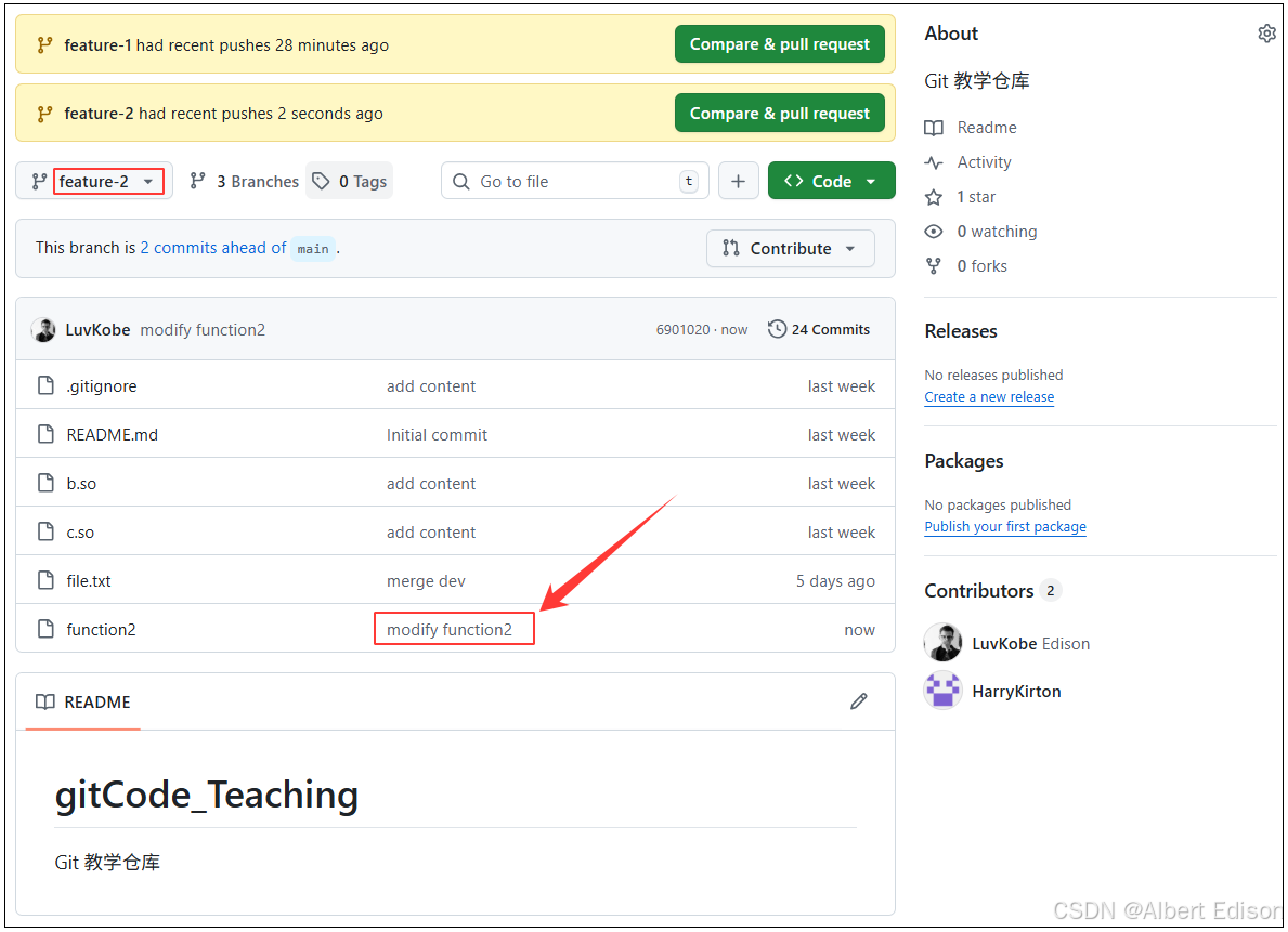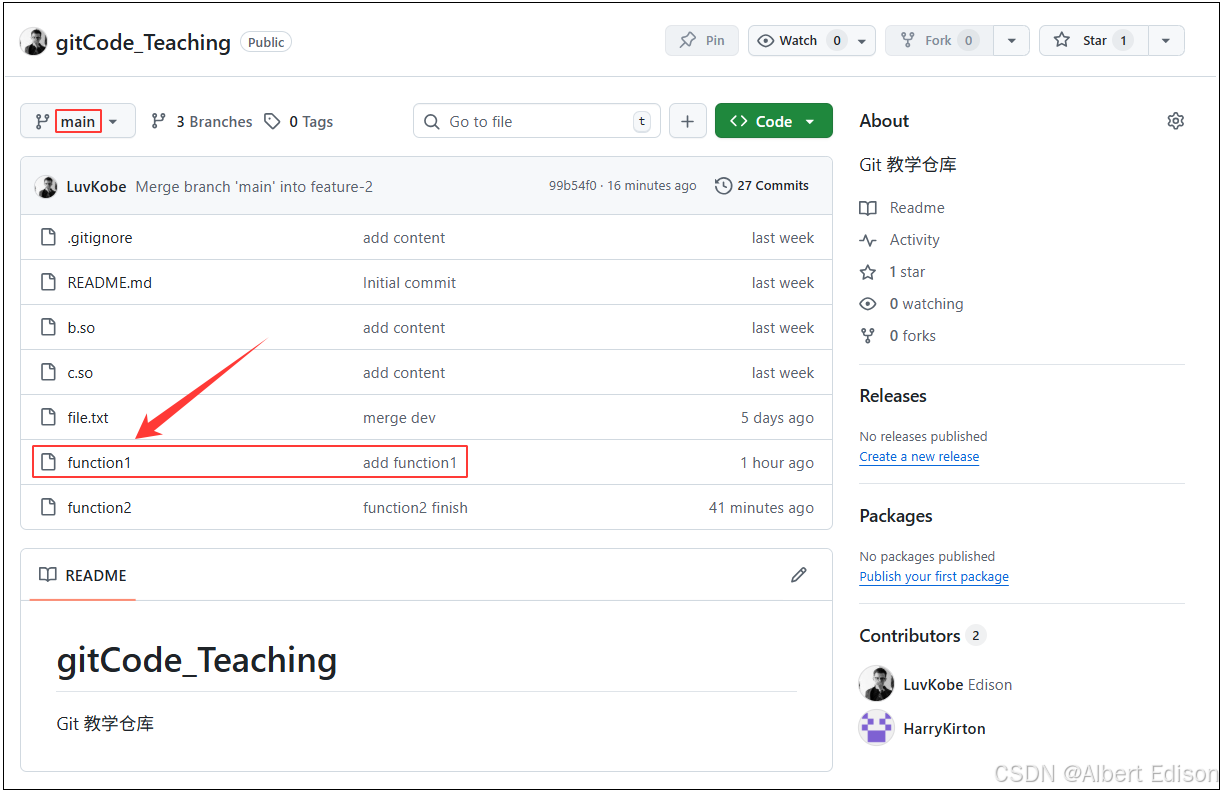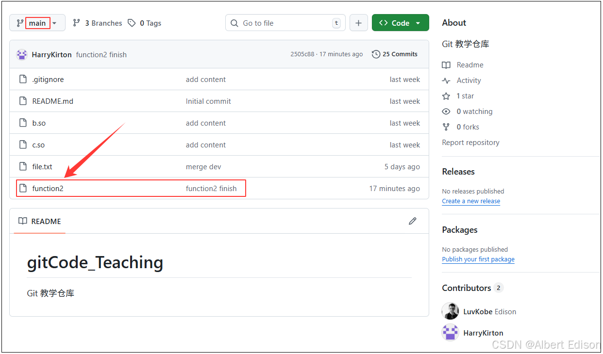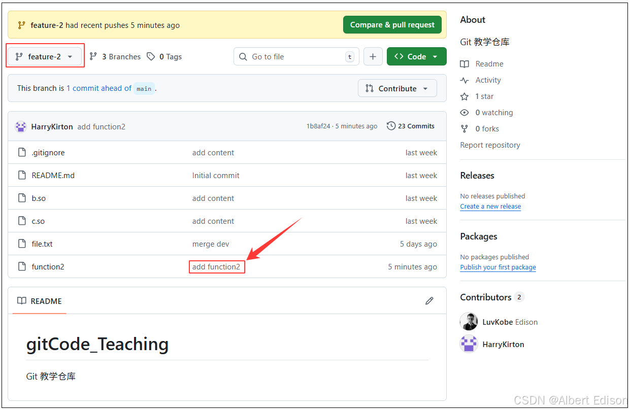 function1文件,由开发者 Harry 新增function2文件。 - 条件:在不同分支下协作完成,各自让某一个功能私有某一个分支。
