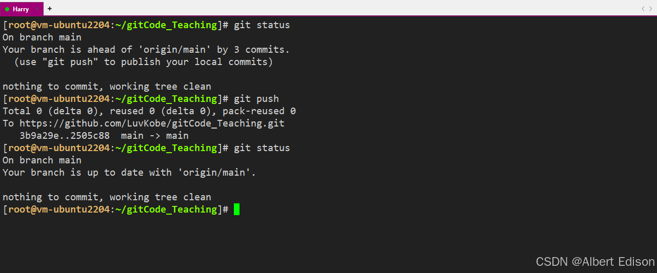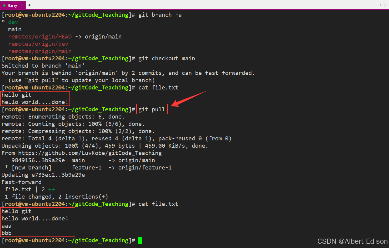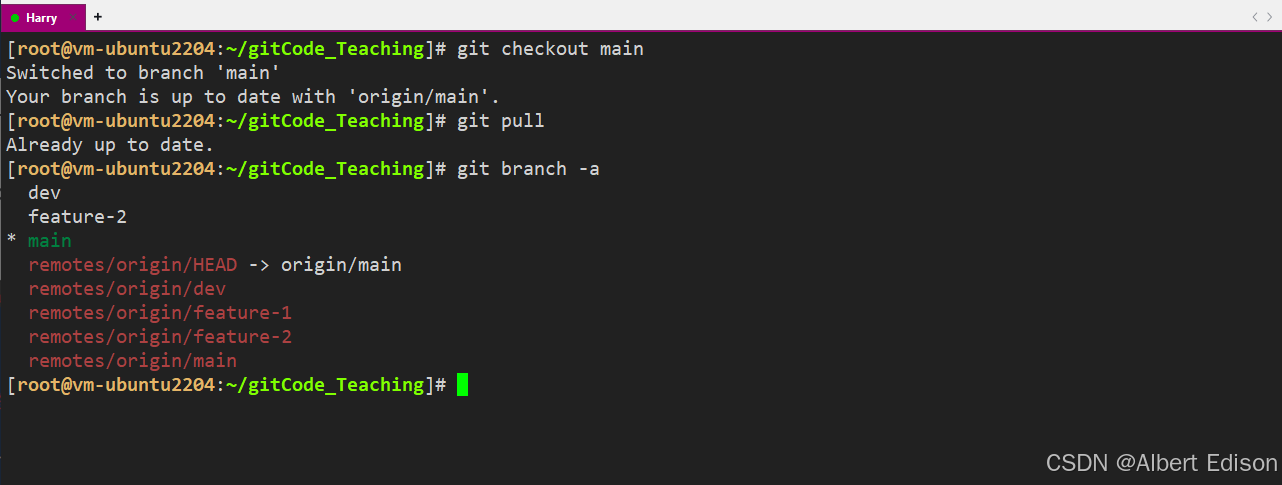 我们在上一篇文章中,Harry 用户下的 main 分支不是最新的代码,所以我们要先切换到 main 分支下,然后拉取最新的代码。