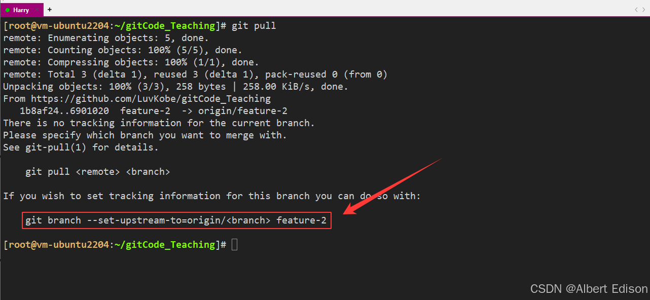 Pull 无效的原因是 Harry 没有指定本地 feature-2 分支与远程 origin/feature-2 分支的链接,根据提示,设置 feature-2 和 origin/feature-2 的链接即可: