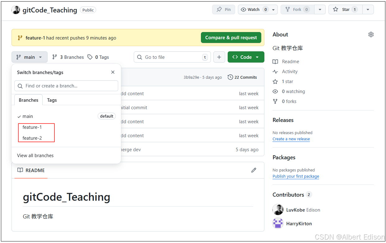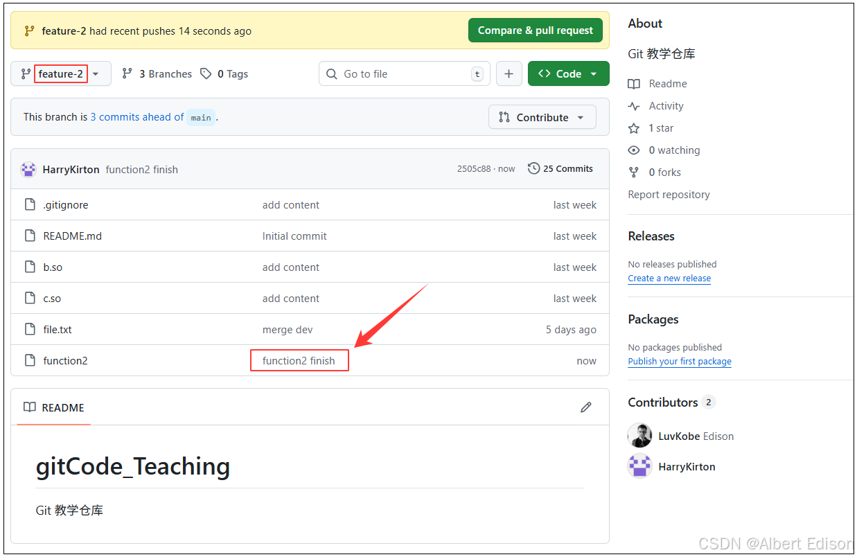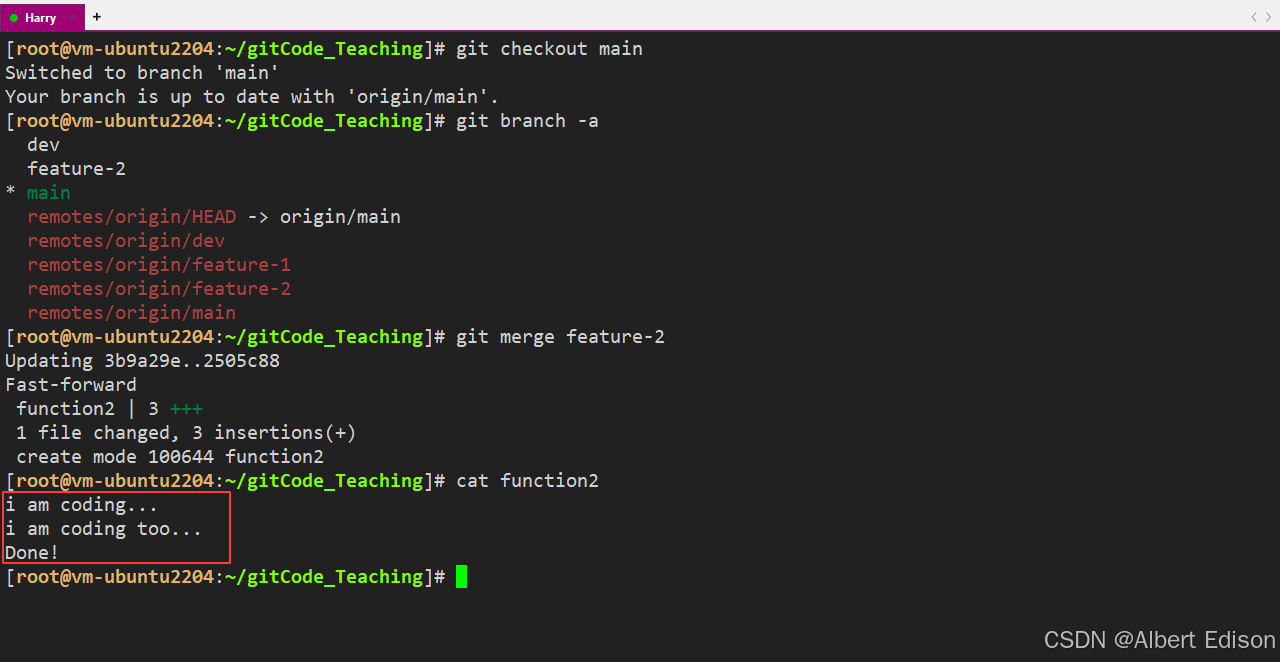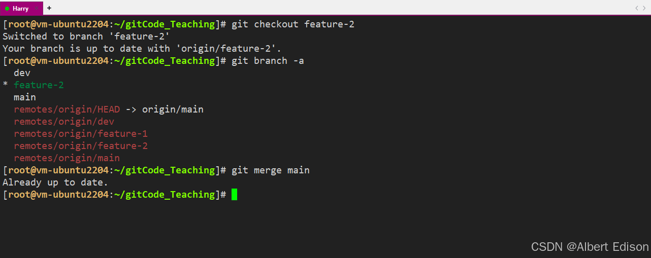结果如下:因为 Harry 用户已经把 feature-2 的内容合并到 main 分支上了,所以此时 main 分支是有更新的。