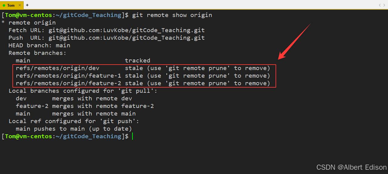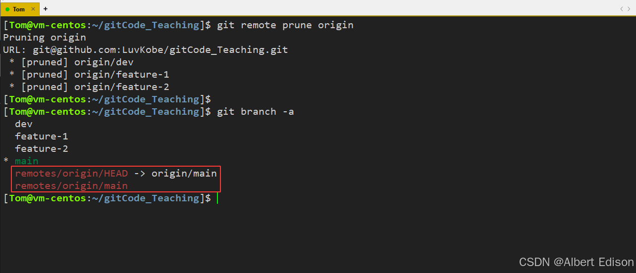 此时我们可以看到那些远程仓库已经不存在的分支,根据提示,使用 git remote prune origin 命令: