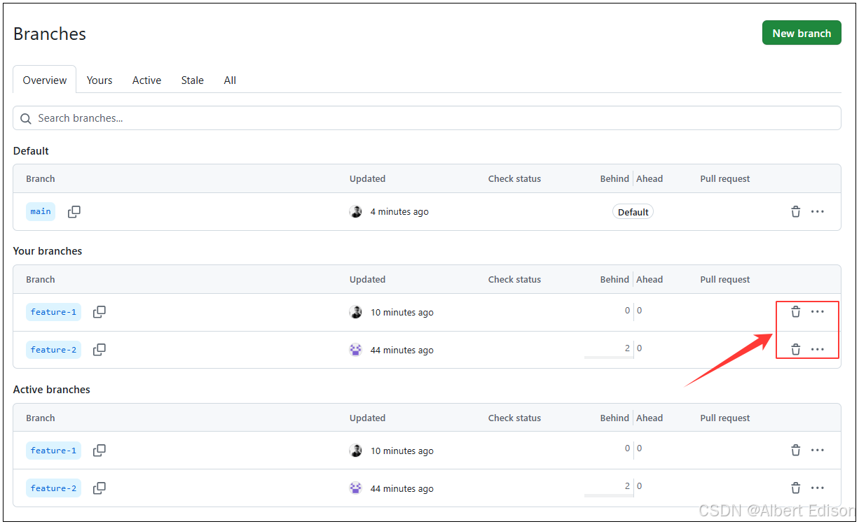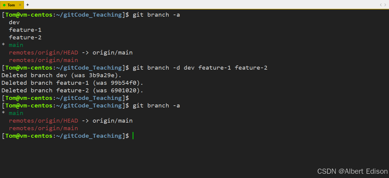 此时,feature-1 和 feature-2 分支对于我们来说就没用了,那么我们可以直接在远程仓库中将它们删除掉: