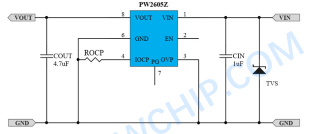 PW2605Z 本质上是一个由逻辑信号控制的智能电子开关。它内部集成了一颗低导通电阻的功率MOSFET,当开启时,输出电压近似等于输入电压减去MOSFET上的微小压降。其设计远不止于此,围绕此开关构建的多重保护机制是其核心价值所在: