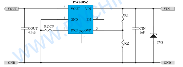 PW2605Z 通过持续监测VIN引脚电压、流经内部MOSFET的电流以及芯片结温来动态管理电源路径。