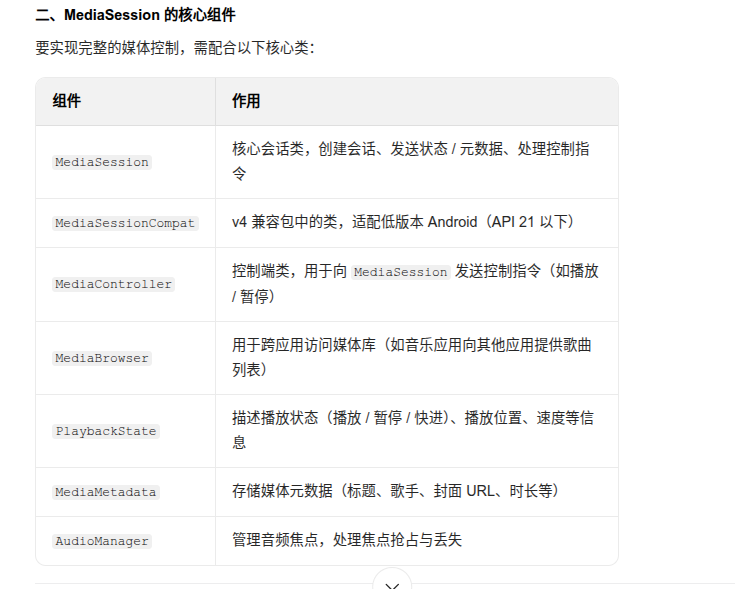 MediaSession 是 Android 系统提供的媒体会话管理类 ,隶属于 android.media.session 包,核心作用是统一管理媒体播放状态、控制指令和元数据 ,实现应用内播放控制 和跨组件 / 设备的媒体交互。