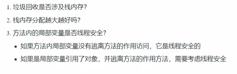 - 方法内局部变量是线程安全的。局部变量存储在栈帧中,每个线程有独立栈,不存在多线程共享的情况。