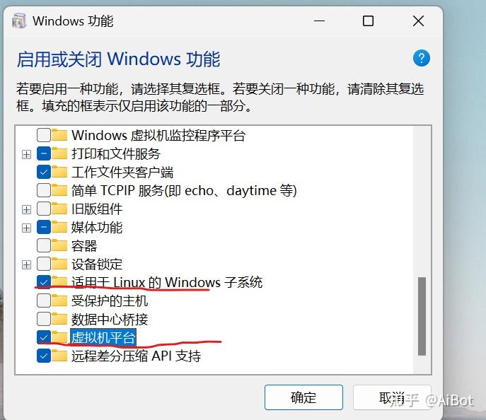 任务栏搜索功能,启用"适用于Linux的Windows子系统" 、"虚拟机平台"