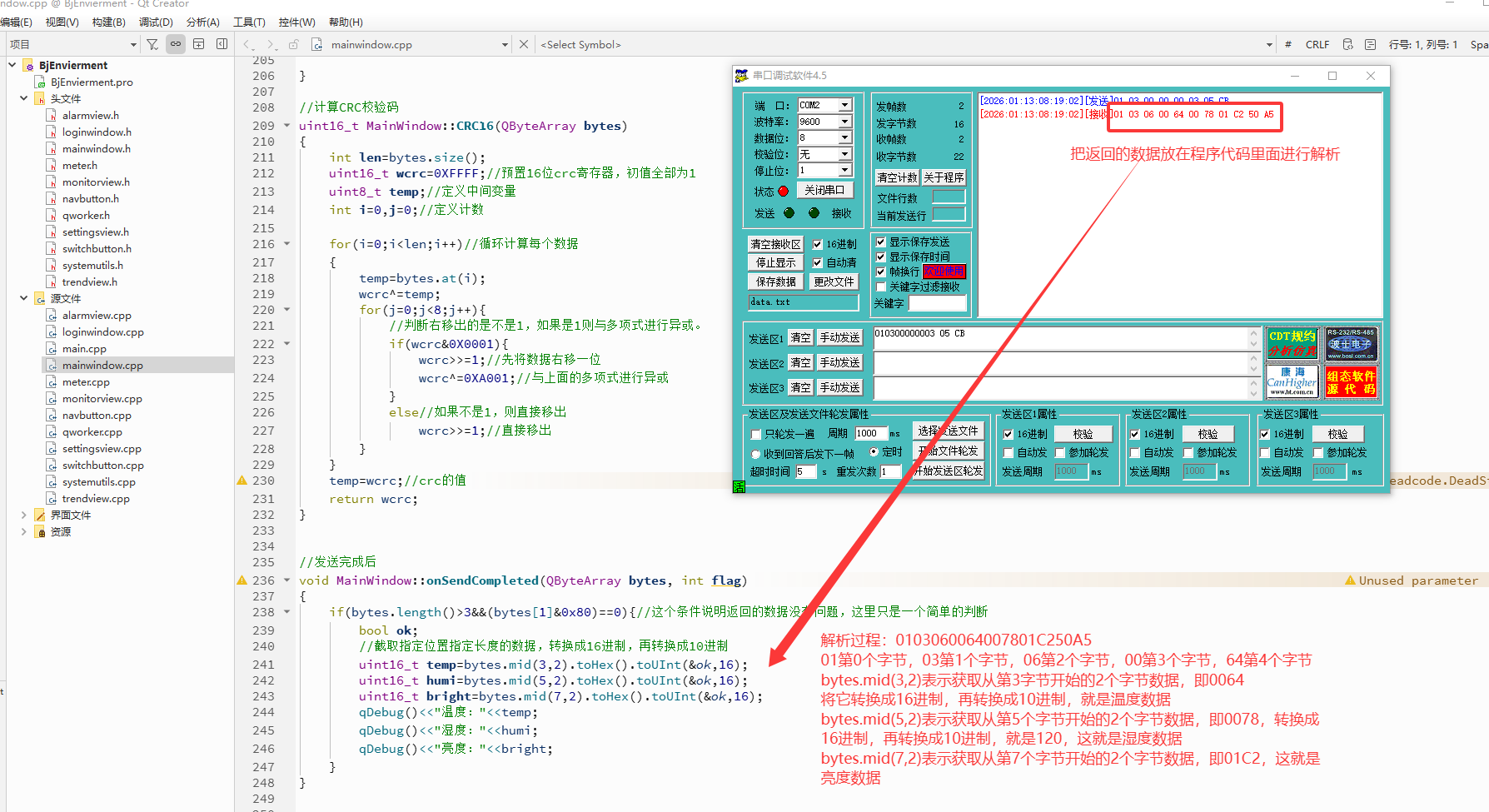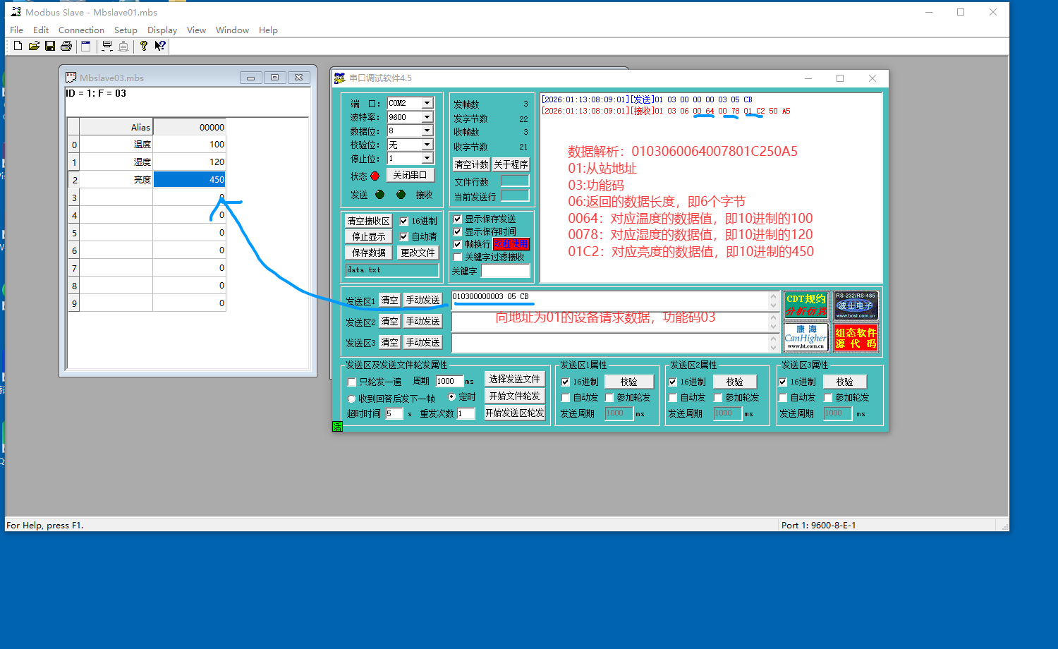 - 读取温度值:使用功能码04读取输入寄存器中的传感器数据。