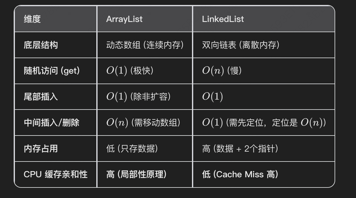 而 LinkedList 内存分散,遍历时频繁发生 Cache Miss(缓存未命中),导致 CPU 必须频繁去主存取数,性能相差巨大。