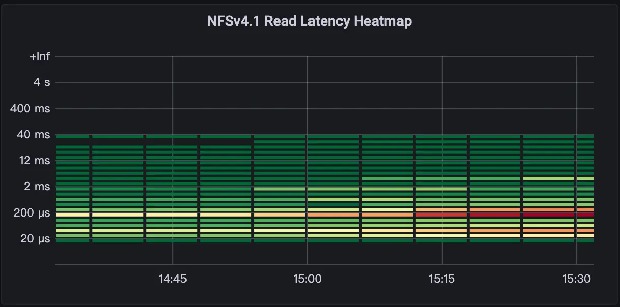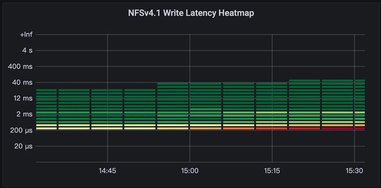 从文件系统写入延迟热力图看 90%的写入响应都在 1ms 以下,同时 91%的读取都在 1ms 以下。