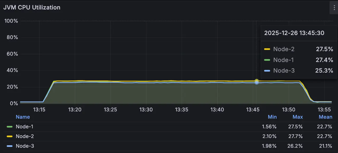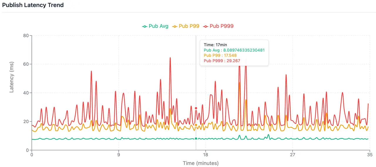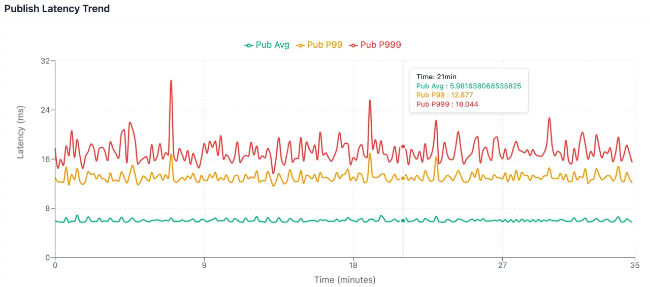 linger.ms=3),并模拟集群满负载运行 状态。此场景旨在验证在真实业务压力下,AutoMQ 是否能提供高确定性的延迟输出,并观察其在处理海量小包写入(High TPS)时的尾部延迟(P99/P999)表现。