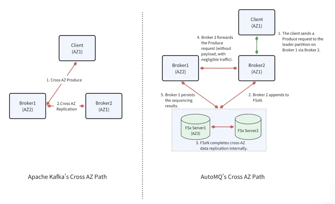 AutoMQ 从整体架构上做了一些变化:采用 AWS FSx 作为 WAL 存储,省去副本复制的流量费;同时通过 FSx 中继客户端和服务端的跨 AZ 请求,减少客户端和服务端的跨 AZ 流量费。由于增加了转发逻辑,会带来少量额外的处理延迟,但却极大的减少了流量成本。