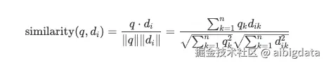 2.相似度计算 :在向量数据库中计算 q与存储的文档向量 di之间的相似度。最常用的度量方式是 余弦相似度(Cosine Similarity) 。 其数学公式如下: