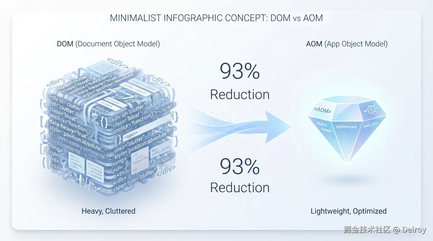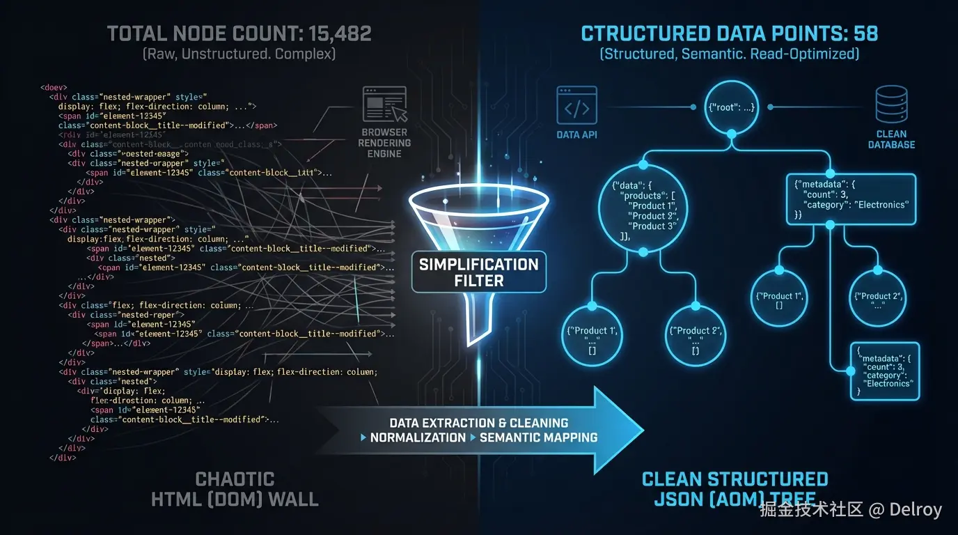 传统的工具会将整个 DOM (Document Object Model) 发给 AI,里面充满了大量的样式、脚本和冗余节点。