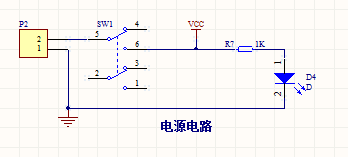 电路在整个设计中起着很重要的作用,是提供器械运转的原动力。本系统供电采用三节并联干电池供电,供电电压为4.5V,电源模块电路为电源开关、电阻和指示灯组成。SW1是电源自锁开关,按下自锁开关后,系统会通电,电源指示灯即发光二极管D4会指示电源是否接通。设计图如图3-4所示: