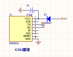 SIM900A只需要电压范围3.4V到4.5V的单电源供电,SIM900A在猝发模式时电流会高达2A,这就需要电源在供电的时候能够保证足够的电流。从电池电压输入端来看,最好使用一个旁路电容,可以使用多层陶瓷片电容,但因其价格比较昂贵,这里使用比较廉价的470uF的电解电容,以降低成本,另外在布PCB板时,该电容要尽可能的靠近VBAT引脚。