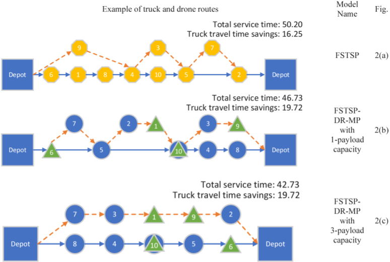 区分配送与退货客户可使无人机在一次出动中完成更多停靠点,显著提升效率。示例结果表明,整合配送与退货并引入多载荷无人机,可持续降低总服务时间并减少卡车行驶时间,但同时增加了路径规划的复杂性,需要同时考虑电池续航与载荷约束。FSTSP-DR-MP模型在明确的运行与安全假设下,以最小化系统完工时间为目标,为最后一公里配送与退货的一体化优化提供了有效方法。