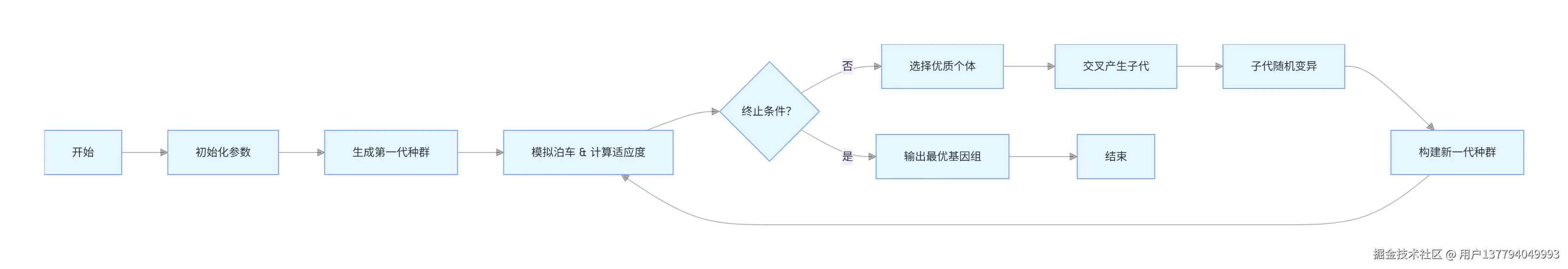 为了得到优秀的基因(180位0/1 序列),解决自动泊车问题。本算法使用遗传算,模拟自然选择,迭代产生更优个体。下图为算法的关键步骤和流程。