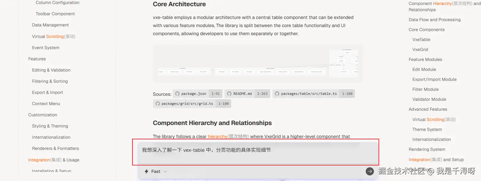 到这里还没完,deepwiki 的一个很重要功能是,它可以通过内置的对话型 AI 助手,让用户自己与 AI 交互,去理解仓库的仓库的技术细节、架构设计或使用方法。比如,如果我想深入了解一下 vex-table 中,分页功能的具体实现细节,我们可以直接在网页下面的搜索工具里面输入: