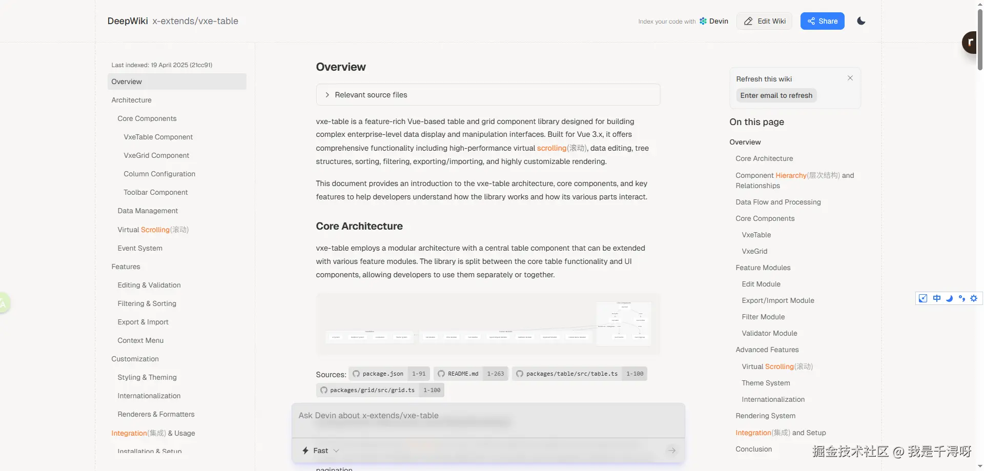 可以看到,deepwiki 对 vxe-table 这个 github 项目重新进行了整理归纳,形成了一个包含简介、架构、构建与脚本、单文件组件、服务端渲染、集成与兼容的一个综合性知识库文档。文档中除了文字还包含大量的图表信息,如架构图、流程图等,我们不仅可以清晰的了解项目的整体结构,还可以详细查看及某一部分的具体使用文档。