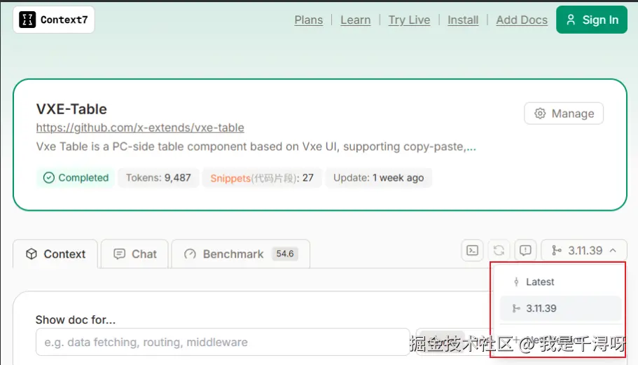 但是这俩 MCP 都有同一个缺点:搜索的库要么不全,要么特定版本没有。在 Deepwiki 中,一些冷门的库搜索不到, context7 中搜索库,版本可能又不全,比如在context7中搜索 VXE-Table,查到的版本只有两个: