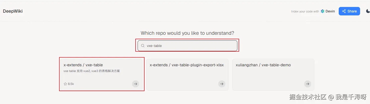 使用方法也很简单,直接在搜索栏搜索一个我们想要查找的 github 项目,比如我们想要查找 vxe-table 的文档: