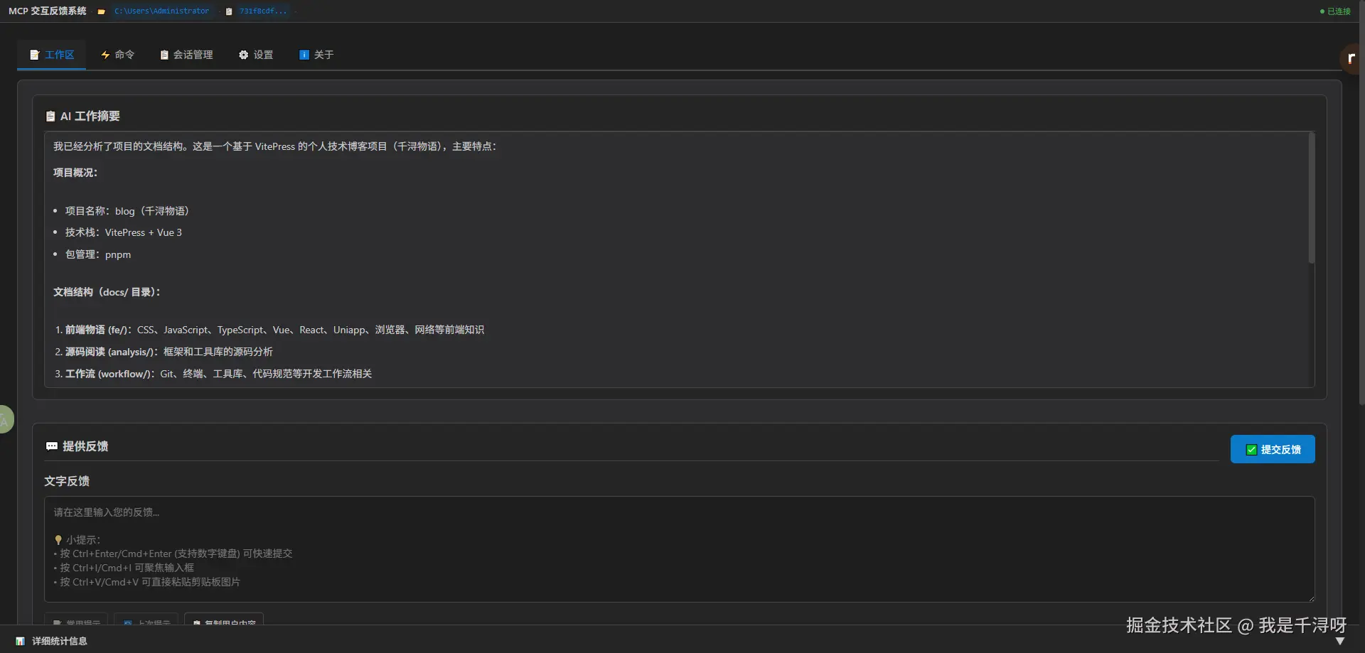 与前几个 mcp 一样,直接在 chat 里你的语句加入 use mcp-feedback-enhanced 就行了。 比如,如果我想查询一下这个项目的目录结构: