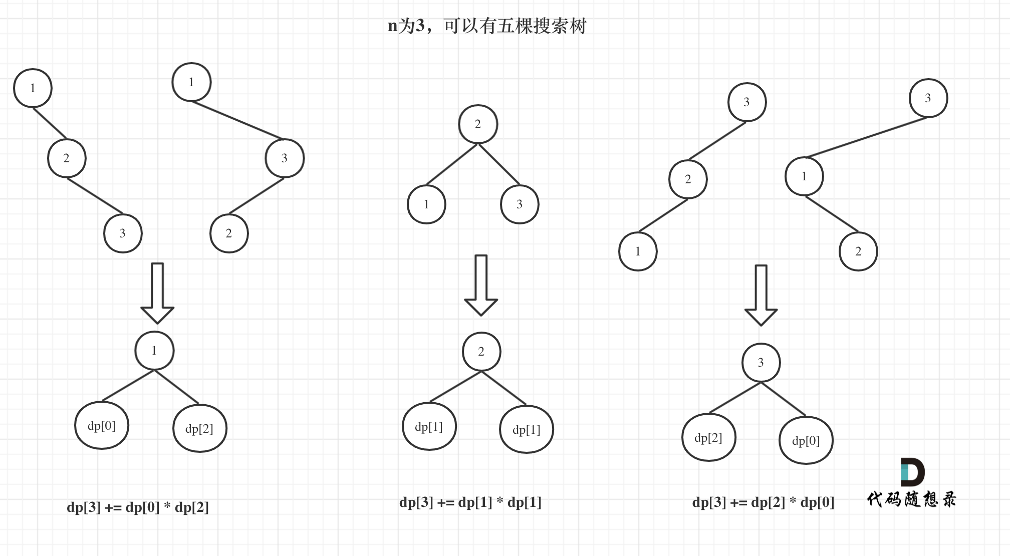 dp[3],就是 元素1为头结点搜索树的数量 + 元素2为头结点搜索树的数量 + 元素3为头结点搜索树的数量