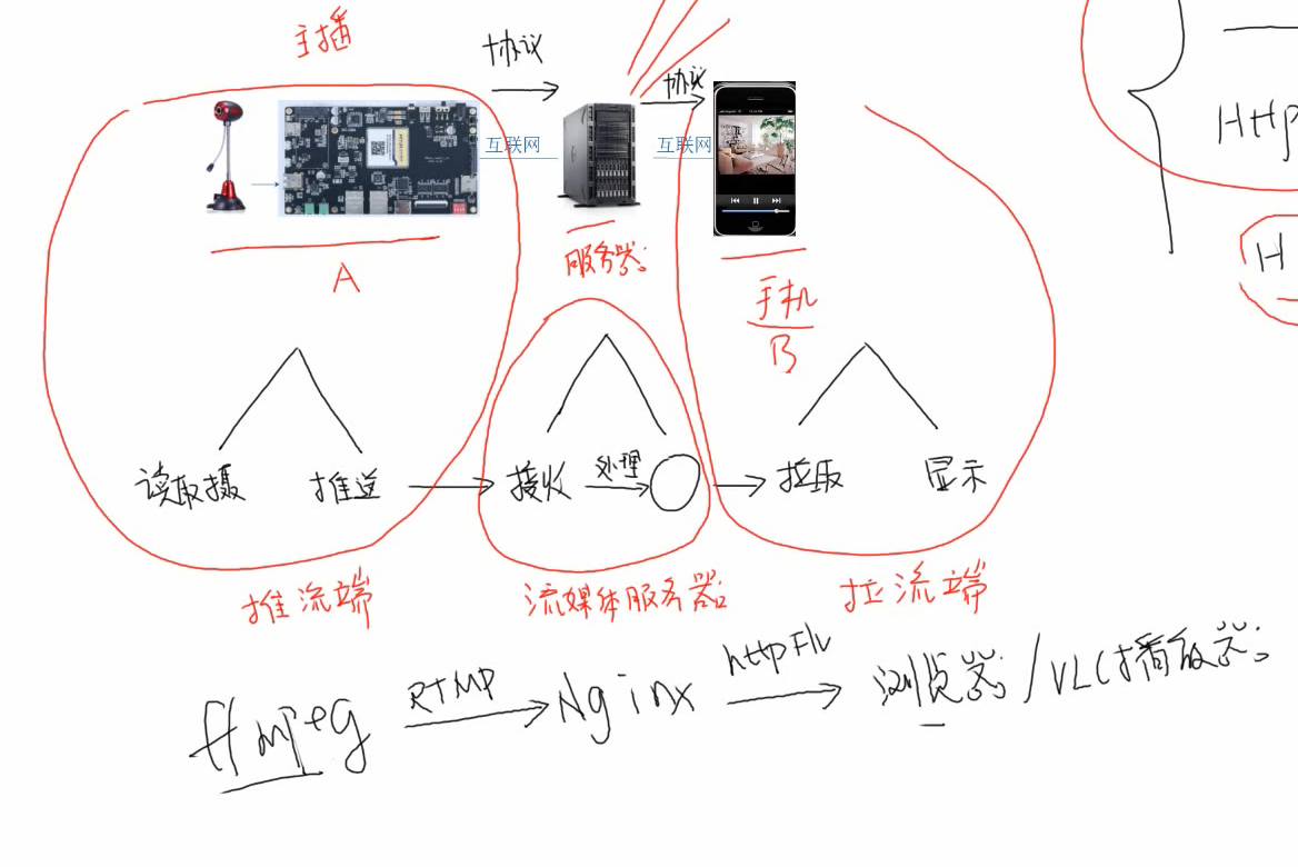 整个过程可以分为三个部分,推流端,流媒体服务器端,流媒体客户端(手机等)。