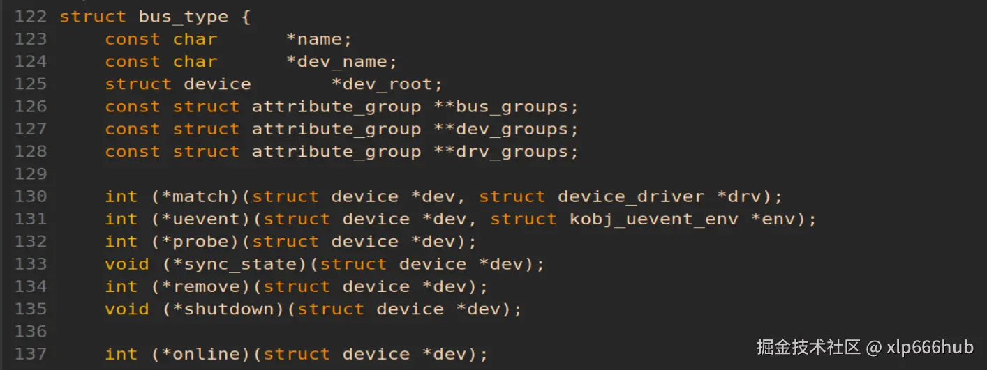 第 123 行是总线名称,比如 "Platform" , "I2C" 等等。