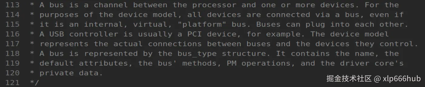 这段注释是内核源码中对于总线的描述,大致意思如下:总线是处理器与一个或多个设备之间的通信通道 。在设备模型的框架下,所有设备都通过总线连接,即使这是一个内部的、虚拟的"平台"总线 。总线之间可以互相连接,例如,一个 USB 控制器通常就是一个 PCI 设备。设备模型反映了总线与其所控制设备之间的实际连接关系。总线由 bus_type 结构体表示。该结构体包含了总线的名称、默认属性、总线方法、电源管理操作以及驱动程序核心的私有数据。