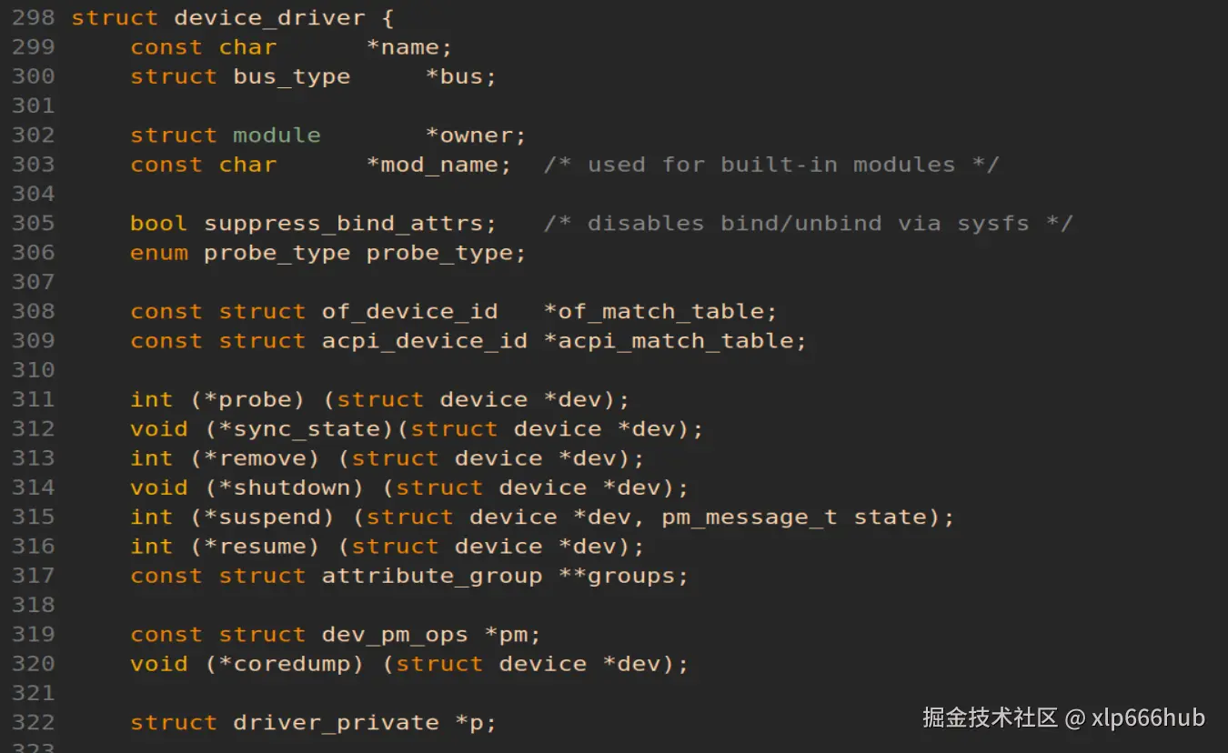 第 308 行,是驱动用来与设备匹配的关键成员。