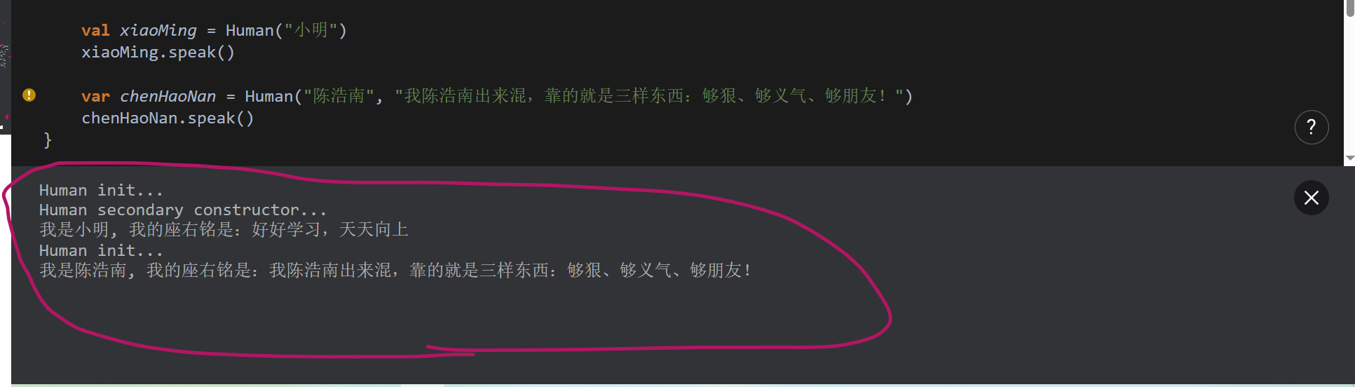 constructor(name: String): this(name, "好好学习,天天向上") { // 辅助构造函数(secondary constructor)