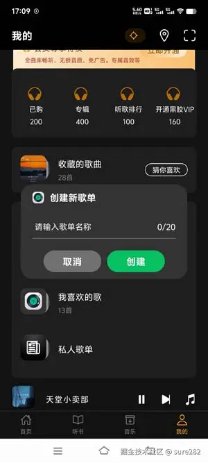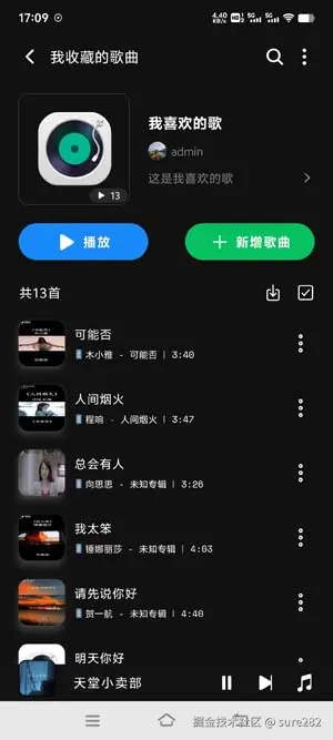 文笔非常一般,但是也算干货满满,文笔不行图片来凑,而且今天我打包了APK安装到手机上,目前测很流畅,比开发构建版本的运行流畅,目前该应用只开发了android版本,ios没有设没有针对性处理调试,接下来再放一些其他模块图片,但是其他有技术难度的值得宣讲的不多,因为该应用没有配套后台,纯本地,就涉及到了数据存取问题,就是使用了Sqlite数据库,后面有时间考虑写一篇文章讲解项目中歌单存取处理,多个单切换设计,播放队列管理等,再放点图吧,上面细节不明白的有问题的欢迎留言探讨