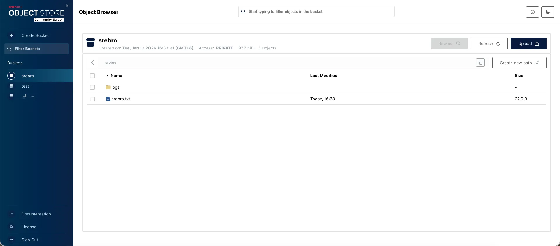 # mc cp srebro.txt minio/srebro/srebro.txt # 上传测试文件