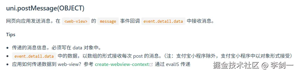 两种方案均不可用,我又详细看了看 uni-app 的官方文档,让 Trae 分析 web-view 标签上绑定的 @message 方法应该是经过特殊封装的,能够捕获到 view-view 内使用 uni.postMessage 方法发送的数据。