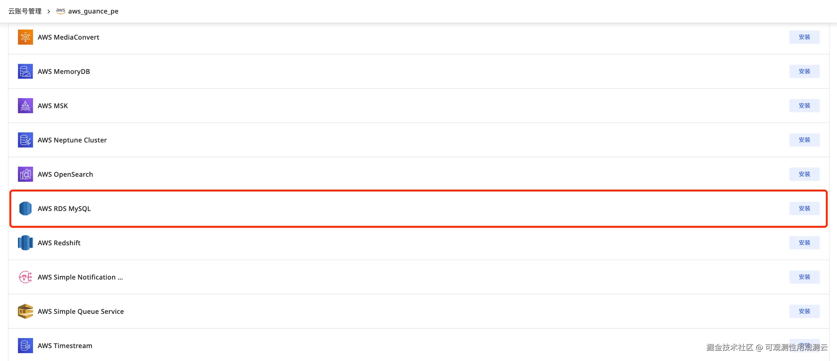 - 点击云账号详情页的【集成】按钮,在未安装列表下,找到AWS RDS Mysql,点击【安装】按钮,弹出安装界面安装即可。