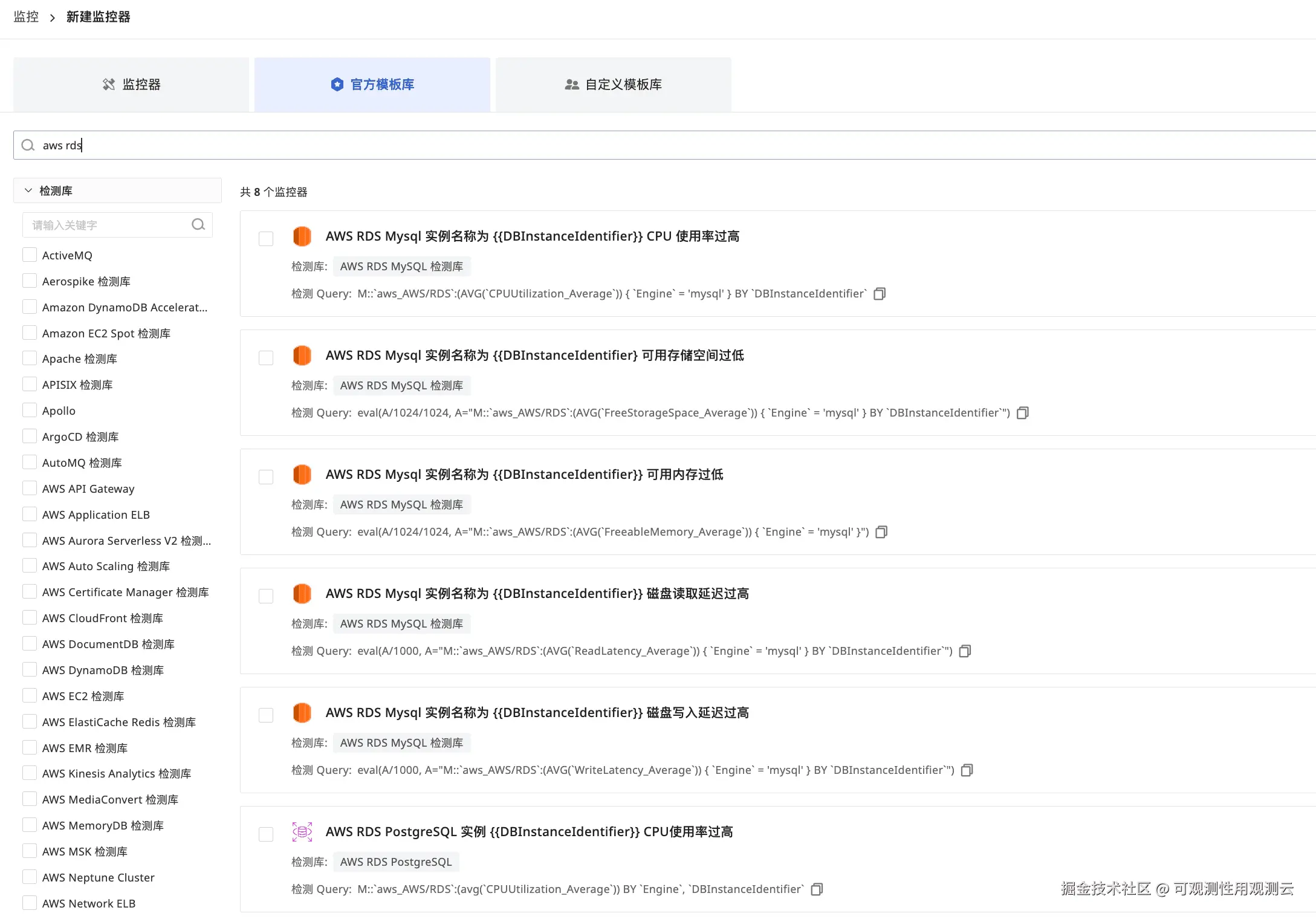 登录观测云控制台,点击「监控」 -「新建监控器」,输入 "AWS RDS", 选择对应的监控器,点击 "确定" 即可添加。