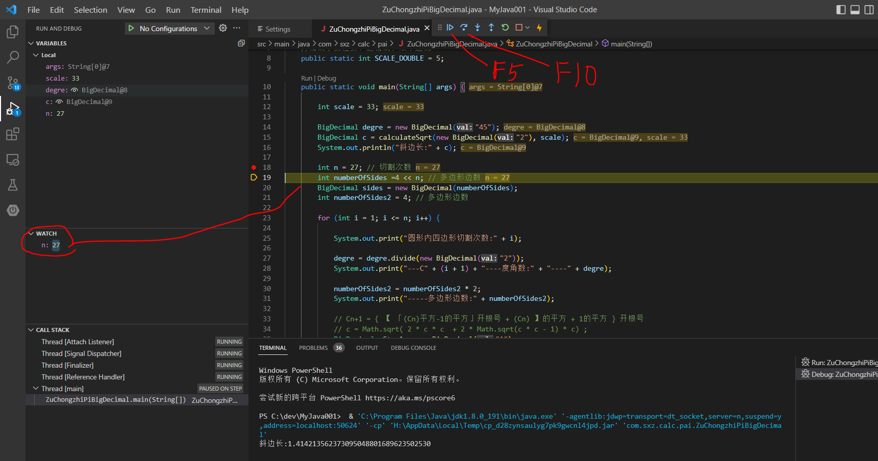 F10:一行一行代码执行 (Step Over 10) 相当于 Eclipse中的 F6:逐步执行