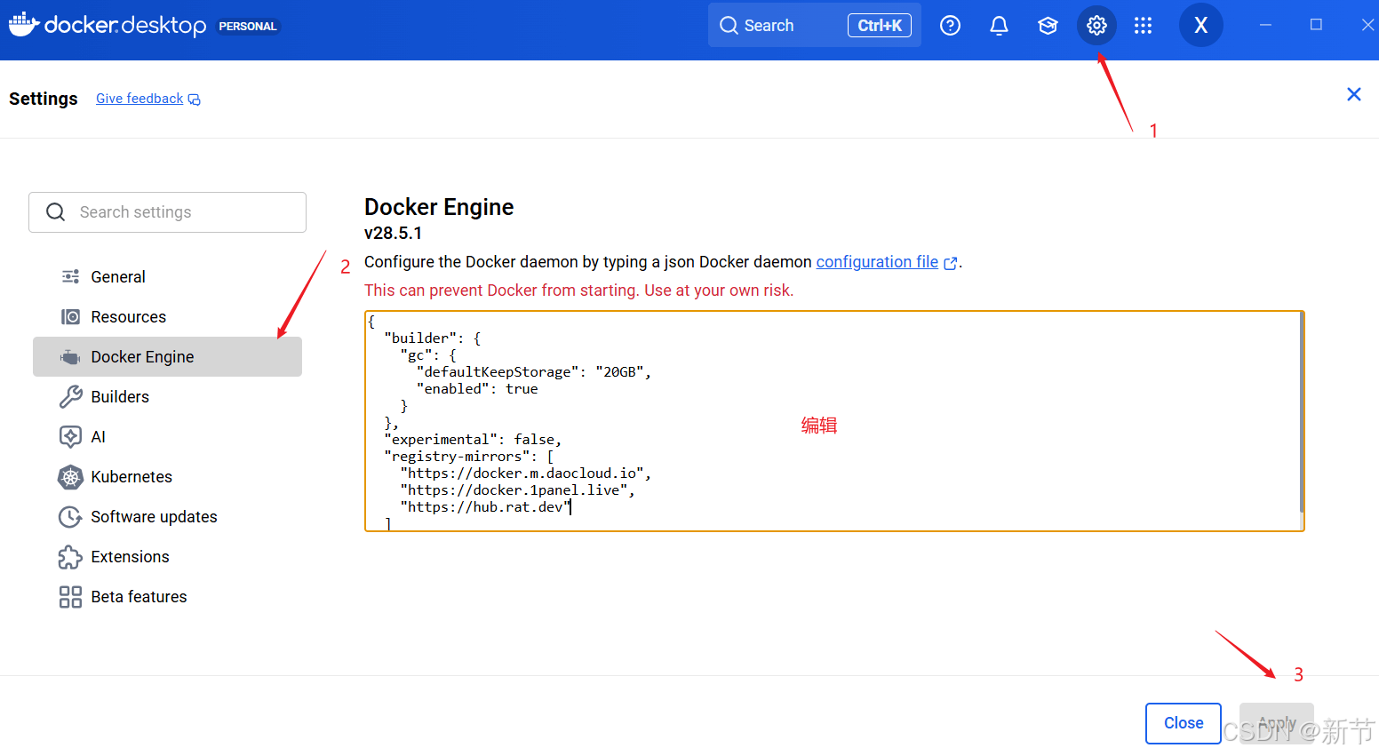 打开 Docker Desktop → Settings → Docker Engine,添加以下配置: